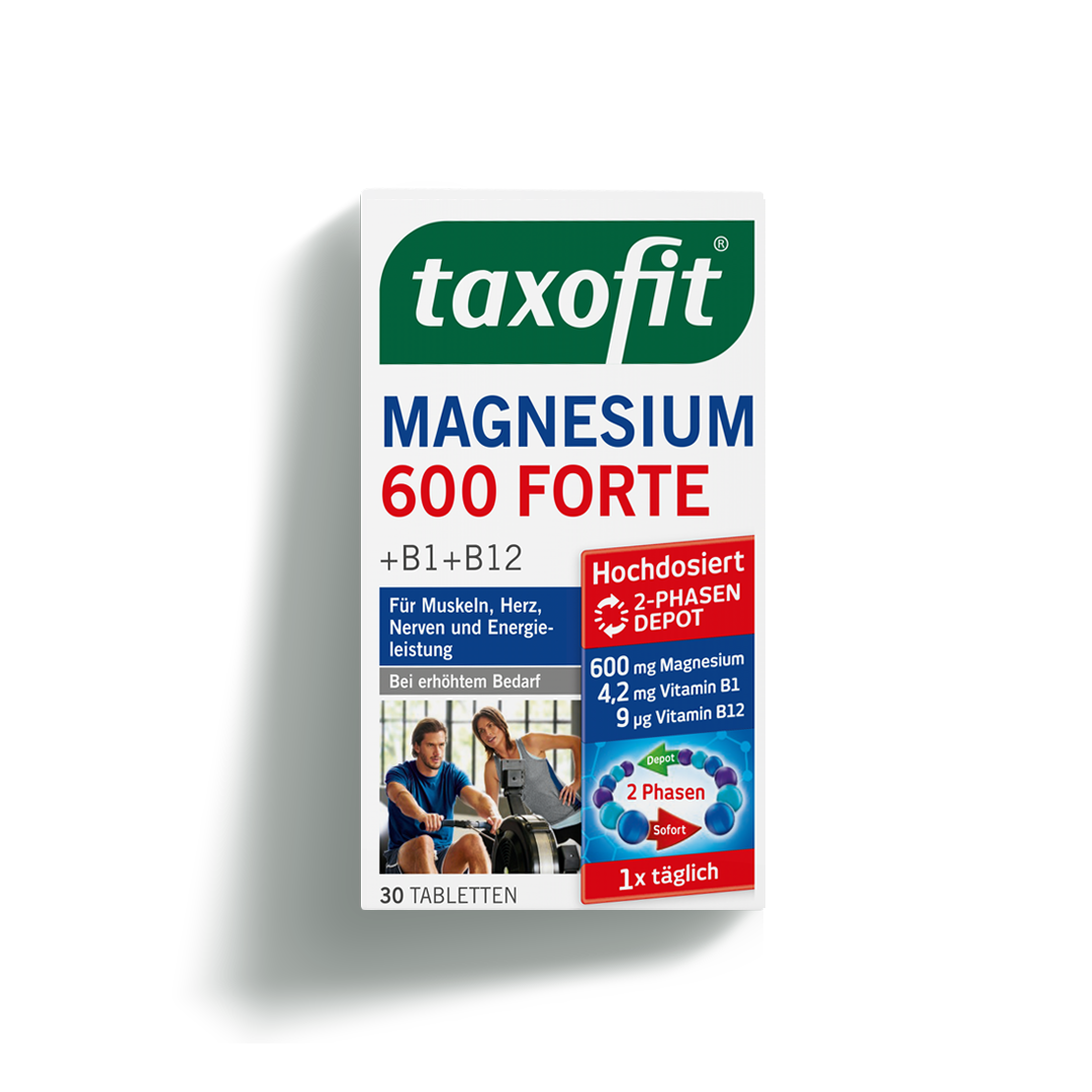 Taxofit Magnezium 600 FORTE ofron mbështetje për aktivitete sportive në doza të larta të magnezit dhe vitaminave Bl, B6, B12. Mbështetë funksionin normal të muskujve, metabolizimin e energjisë dhe sistemin nervor. Vegan. Pa gluten, pa fruktozë, pa laktozë, pa sheqer. Përdorimi: 1 tabletë çdo ditë me ujë gjatë ushqimit. I përshtatshëm vetëm për të rritur. Të ruhet në thatësi dhe jo mbi 25°C. Përmbajtja: 50,4 g (30 tableta).